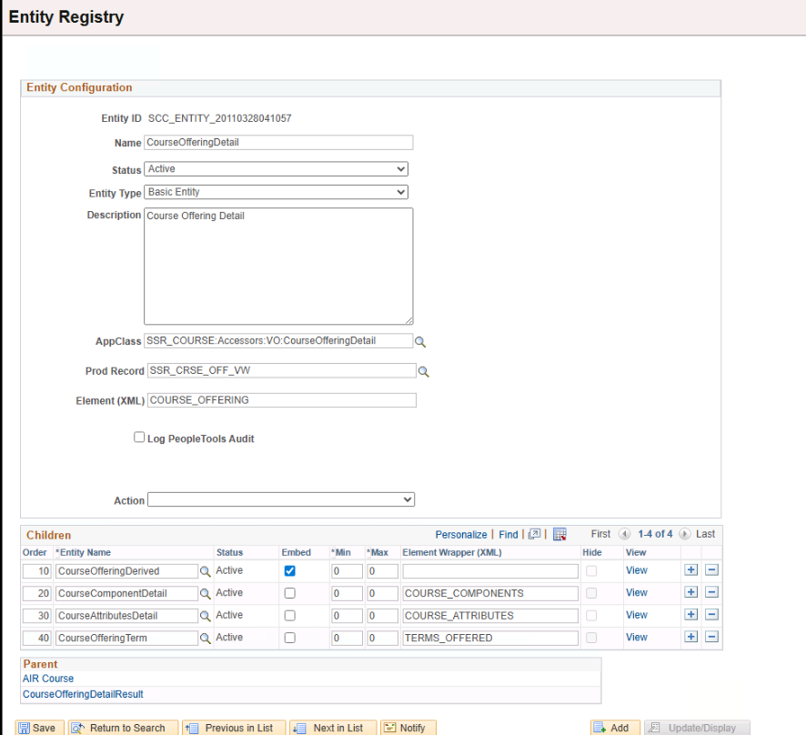 Additionally, what I find frustrating is that this is not used elsewhere in PeopleSoft Campus. If you are a PeopleSoft developer, you may be familiar with Application Classes and how they can be used to encapsulate business logic. The Entity Registry is a way to map these application classes to database records and define relationships between them. That is a cool concept, but it is only used in a few places in Campus Solutions, mainly in the Enrollment Web Services (EWS) for handling shopping cart operations and some Admission web services which I don’t recommend using.